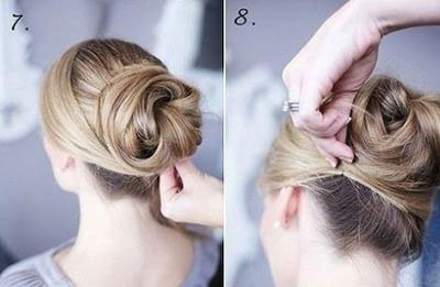 Step7:如果你的刘海够长,可以将刘海的发尾藏进发苞里,形成一体的感觉。 Step8:稍加整理头发啊,把细碎的头发用定型液固定起来,把蓬度营造出来看起来更自然。
