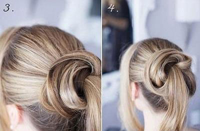 Step3:然后取马尾中的一小搓头发按照同样的方法用逆方向环绕,用黑夹固定起来。 Step4:再按照同样的方法盘一下,这次绕的不要太紧否则会看起来不自然。