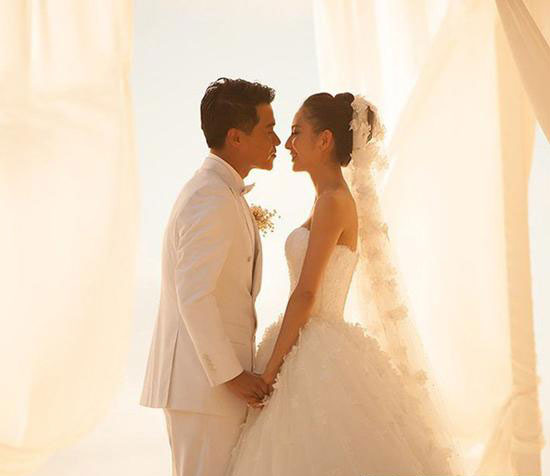 微闭的双眼,微卷的及肩长发,美丽通透的妆容,幸福的面容,水天一色的背景,美好静寞的气质,充满了梦幻浪漫的感觉,沉静、等待的气场都能宣示着女神早已准备好为人妻的。