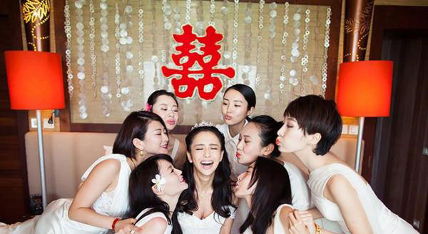 佟丽娅的华丽伴娘团,做为主角的佟丽娅坐在床上正中间,伴娘们相互做出亲吻的姿态。女神黑色微卷长发,头顶配戴白色镶钻王冠,华丽不失甜美,宛若出嫁的贵公主哦。