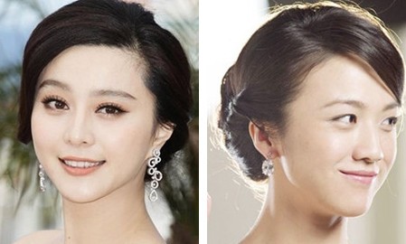 中分刘海发梢微卷自然垂放在脸颊两边,头发随意盘在脑后略显凌乱。不同于冰冰的清新与活力,汤唯的盘发散发着出尘的文艺女生的气质,简单而又自然的盘发却塑造出截然不同的两种气质,都让人目不转睛。