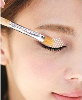 STEP1:让眼窝加深眼神立体:挑选浅咖啡色眼影,抹在眼窝到眼头位置,能加深五官的立体。