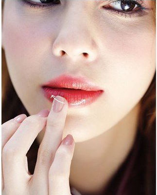 STEP4:橘红唇膏用指腹轻点:挑选橘红色雾面唇膏,用手由双唇中央往外轻点均匀。