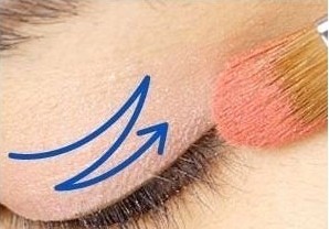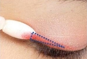 眼角的三角区的画法,用眼影棒喷湿后按干,沾取深粉红色,从上眼头到眼尾画出一个较宽的三角形。