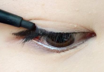 1、眼线笔填实睫毛根部和内眼睑,眼尾稍许上扬。