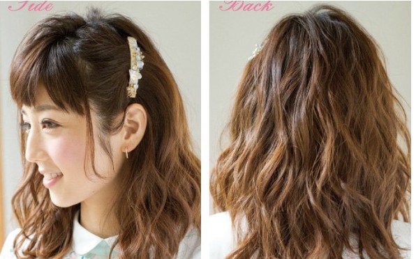 这款发型只是简单的用水晶发夹固定耳朵旁的头发,打造出不对称的美感,很有公主头的甜美感觉。