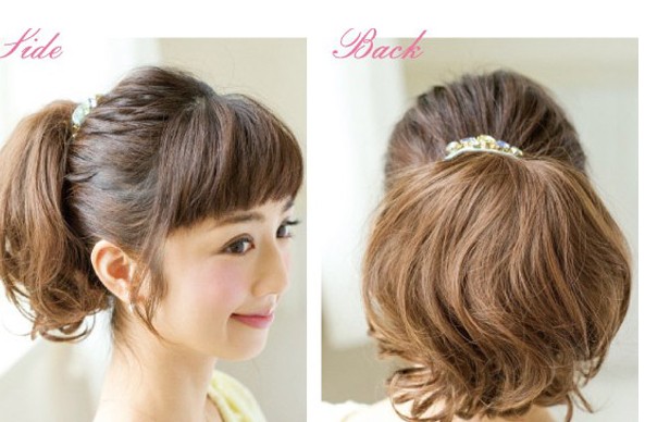 step2:取出一只假发马尾片固定在脑后。