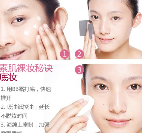 无瑕是素肌裸妆的基础,但无瑕裸妆不等于苍白脸色,成功的裸妆要求能够呈现健康肌肤的光泽,雾面质感的肤质最耐看。因此,用BB霜打造底妆,可以使用吸油纸和蜜粉加强妆容的持久度和雾面效果。