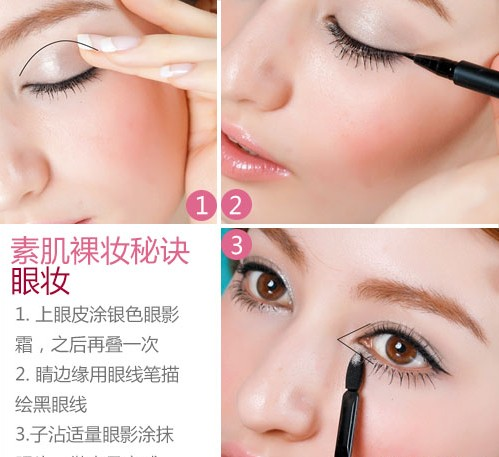 白皙的底妆需要靠妆容的其它部分来点亮,因此裸妆尤其强调眼妆。巧妙把银色眼影霜和眼线结合起来,有神明眸配上素肌裸妆,女神范初现!