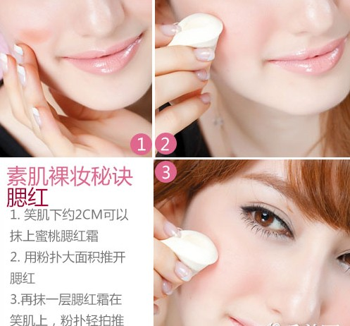 双颊上一抹淡淡的腮红可以给人健康红润的感觉,要打造与裸妆相匹配的腮红,下面的步骤就要好好留意了。
