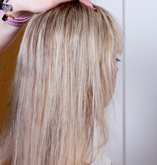 step1:打造这款发髻头发需要有足够纹理,太顺滑的直发会增加难度,而头发太卷曲做出来效果会很混乱,所以在直发基础上增加蓬松度就可以了。在发根抹上一些喷雾摩丝增加丰盈度,然后用吹风机吹干。如果你的头发比较细软,就多用一些摩丝,不要担心用太多,它们会让这款发型更容易实现。