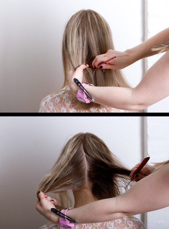 step7:下面开始最重要的固定工作,将发卡插入第一个发结和头发之间固定。