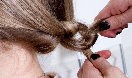 step6:看仔细了,将攥着发尾的手逆时针拧转,让发梢在发结的左右两边。