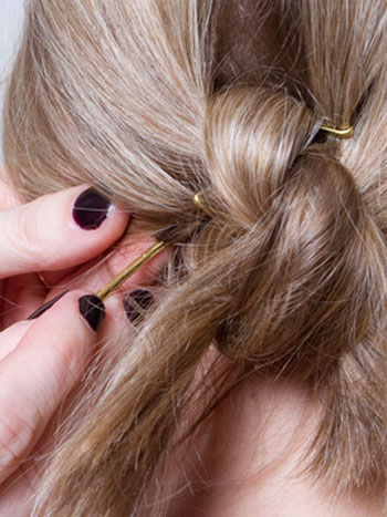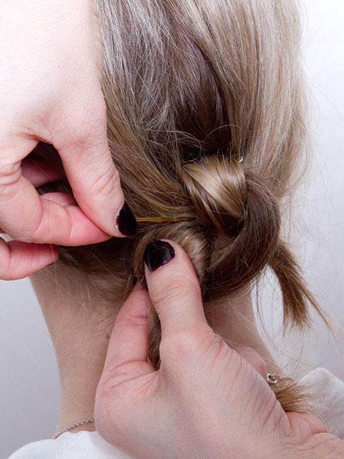 step8:再用发卡固定第二个发结,你还需要第3个发卡穿过两个发结之间固定。