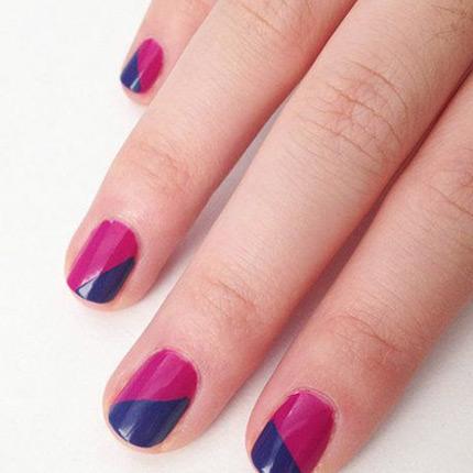 两种颜色的对比十分和谐,而且操作起来非常简单,先将艳粉色涂满指甲,待干燥后用深蓝色甲油斜拉一条直线,再涂满直线到指尖的空白区域即可。