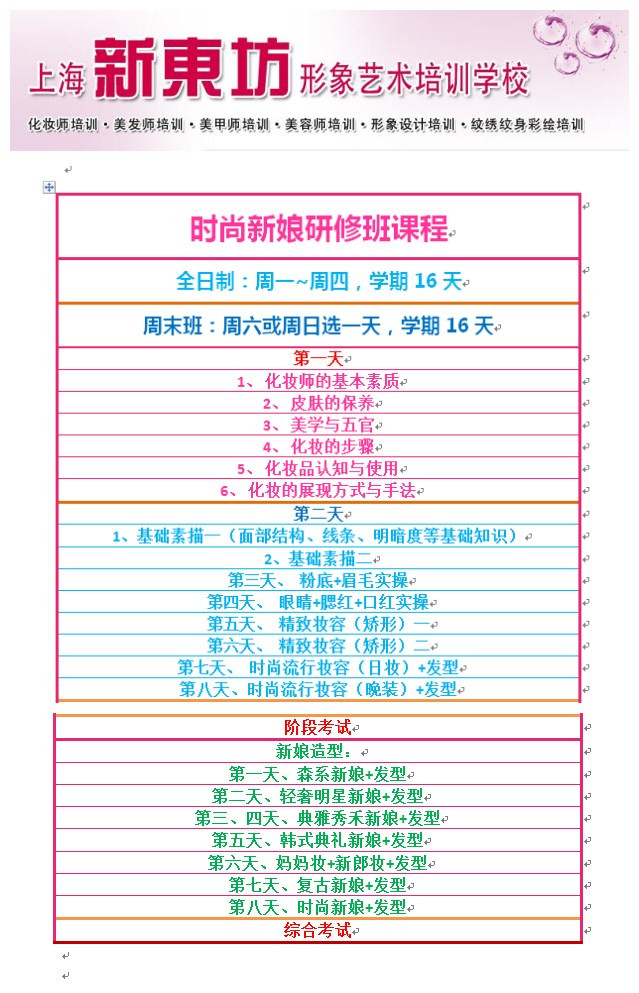 新东坊美容师培训,化妆师培训,美甲师培训,美发师培训,形象设计师培训,初级、中级、高级、技师、高级技师培训,就业培训、创业培训,新娘彩妆培训、影视化妆造型培训、白领形象设计培训、演员明星各种造型、各种主持人模特造型。