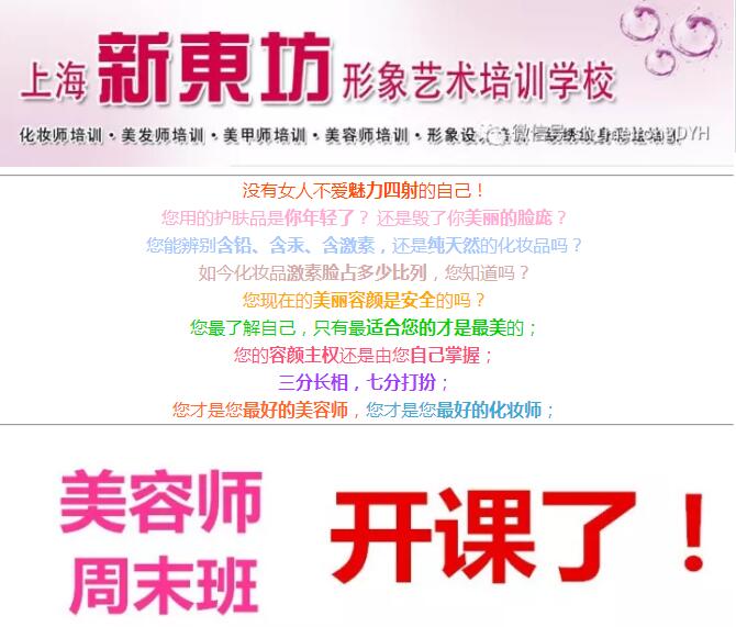 新东坊美容师培训,化妆师培训,美甲师培训,美发师培训,形象设计师培训,初级、中级、高级、技师、高级技师培训,就业培训、创业培训,新娘彩妆培训、影视化妆造型培训、白领形象设计培训、演员明星各种造型、各种主持人模特造型,芳香美容专项。