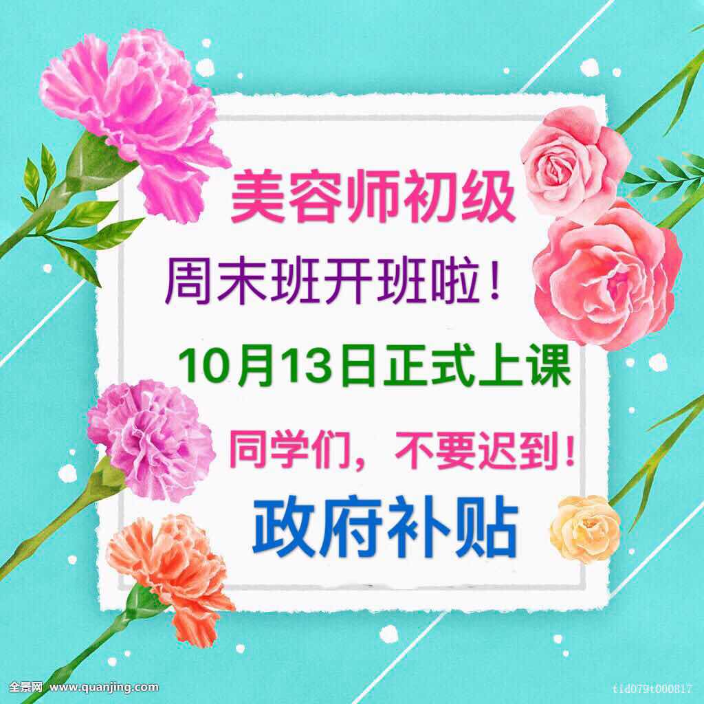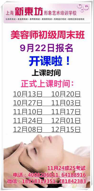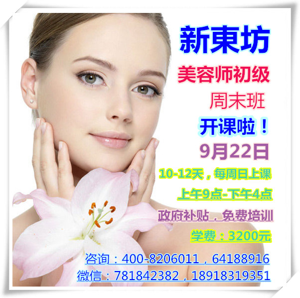 【美容初级-周末班】,9月22日报名,10月13日正式上课【政府补贴.免费培训】每周六上课,预约报名电话:4008206011
