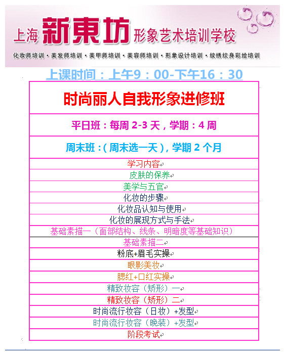 新东坊美容师培训,化妆师培训,美甲师培训,美发师培训,形象设计师培训,初级、中级、高级、技师、高级技师培训,就业培训、创业培训,新娘彩妆培训、影视化妆造型培训、白领形象设计培训、演员明星各种造型、各种主持人模特造型。