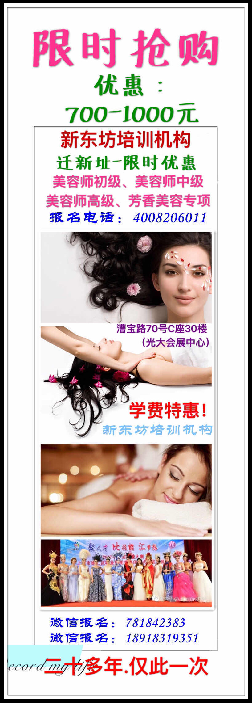 新东坊美容师培训,化妆师培训,美甲师培训,美发师培训,形象设计师培训,初级、中级、高级、技师、高级技师培训,就业培训、创业培训,新娘彩妆培训、影视化妆造型培训、白领形象设计培训、演员明星各种造型、各种主持人模特造型,芳香美容专项。