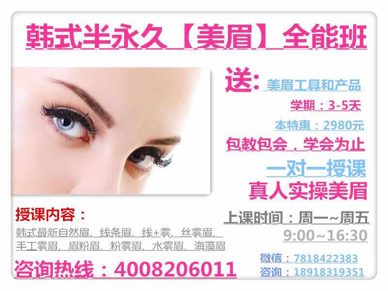 授课内容:(眉毛、美瞳线、水晶嘟嘟唇、发际线、韩式最新自然眉、线条眉、线+雾、丝雾眉、机器雾眉、手工雾眉、眉粉眉、粉雾眉、水雾眉、海藻眉等等)。