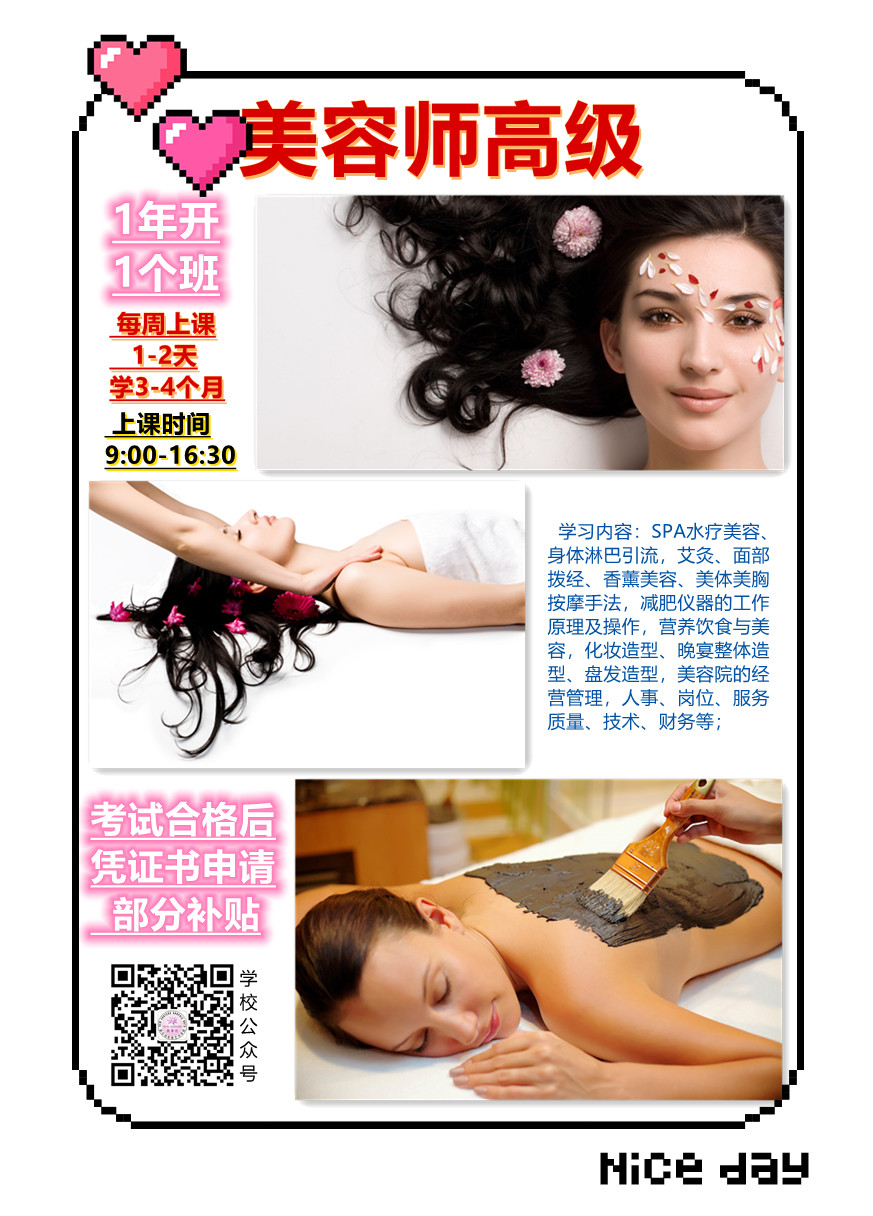 高级学习内容:问题性皮肤的诊断和护理,中医理念、SPA水疗美容、身体淋巴引流,纹刺美容、香薰美容、美颜美体与膳食结构,丰胸,减肥的按摩手法,减肥仪器的工作原理及操作,营养饮食与美容,化妆造型、晚宴整体造型、各种盘发的造型,美容院的经营管理,人事、岗位、服务质量、技术、财务等;