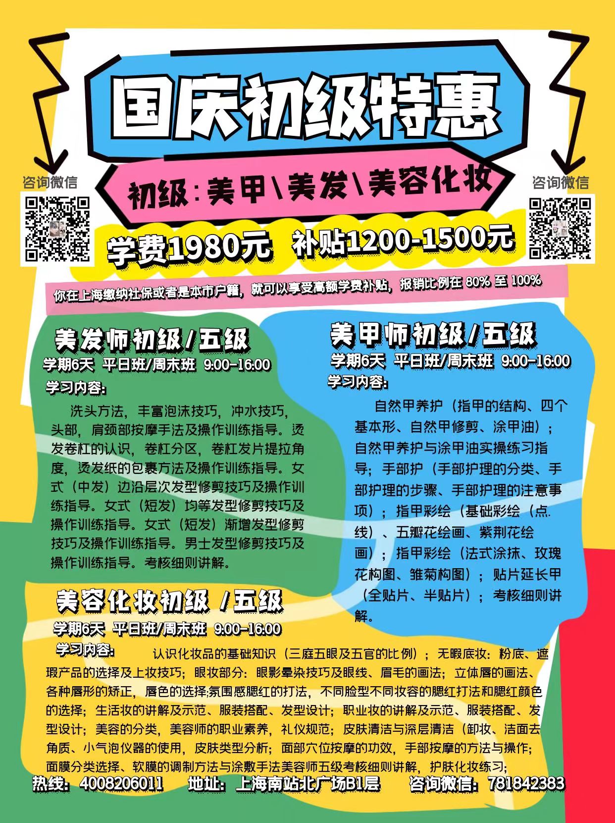 #美容培训 #美妆培训 #美发培训 #美甲培训 #学美妆 #学美发 #学美甲 #零基础学化妆 #零基础学美发 #零基础学美甲 💖学美甲,美容化妆,美发有学费补贴啦!😎 学费 1980 元起💰,申请补贴高达 1200 -1500 元! 🥰还能考取专业认可的等级资格证书哦!✨ 如果你在上海缴纳社保或者是本市户籍,就可以享受高额学费补贴,报销比例在 80% 至 100% 之间呢!👏🎉 🌟学完课程,不管你是出于个人兴趣🎀,还是为了就业创业💼,都能为你的未来增添光彩。 😜新东坊培训学校专业培训:美发师,美容师,化妆师,美甲师,形象设计师,涵盖初级、中级、高级、技师、高级技师各个等级。课程技能与国际接轨,丰富多样的课程任你挑选。💃 💡这里有平日班、周末班、随时班,随你所需进行选择。 😉无论你是忙碌的上班族👩💼,还是时间灵活的自由人🎈,亦或是在校学生们👨🎓,都能找到适合自己的学习方式。🥳 |