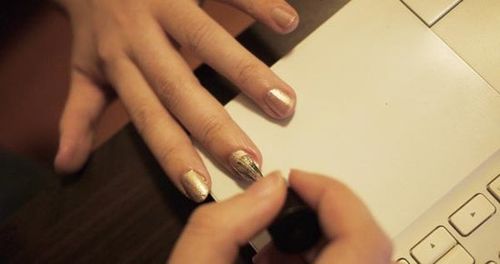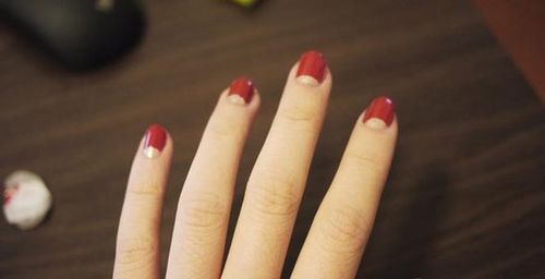 将第二种颜色涂抹在指甲上,颜色可以自由选择。如果底色是深色的话,表面颜色就需要选择遮盖力好且高饱和度的色彩,且涂抹两遍,才能完全覆盖底色。不过如果你玩的就是两种颜色的混搭,那就随便喽。比如编辑选的金色为底色,如果表面的红色只涂抹一层的话,能看见金属的光泽透出;如果涂抹两遍红色,就是纯正的漆光大红色。