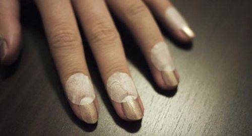 将剪好的小圆纸片用水沾湿,你会发现它变成软软的透明色。将它覆盖在你的指甲末端,预留出你想要的长度,用手指轻轻将其按压,直至完全贴合指甲表面。接下来稍等片刻,纸片干燥后又会变成白色,但是仍然会牢牢的覆盖在指甲上