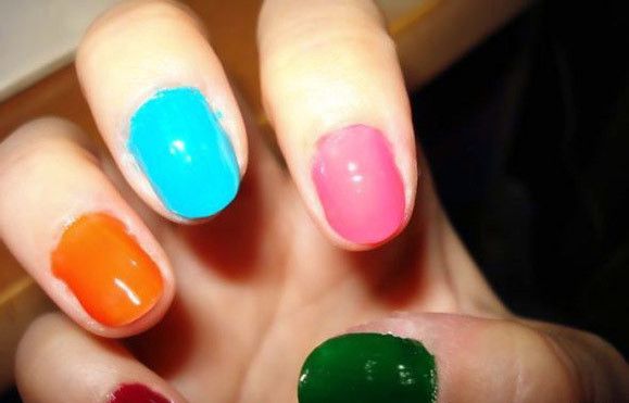 步骤二:每个指甲上涂上一种颜色指甲油,如果觉得不够,再涂上一层,颜色就饱和很多了?
