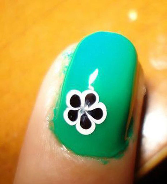 步骤三:接着就是点花了,点完之后马上用针或者牙签的尖头部分将圆点向中心挑一下,形成一朵圆润的小花。海海用的是挑粉刺的美容针,那个挑花很方便,够大只很好拿。