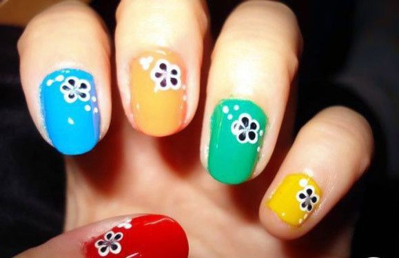 步骤四:在每只手指上都点上这样的小花。再用小圆点点缀在花的周围,让整个图案更平衡也不单调。这样度假风的绚丽美甲就做好了。等干了之后再涂上一层亮油效果会更好哦!