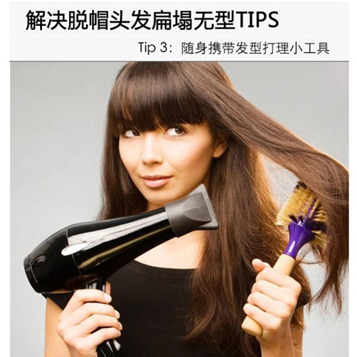 许多品牌都推出了可以随身携带、时刻补涂抹的便携式护发造型产品,摘掉帽子后,可以将免洗护发产品喷洒或者涂抹于头发上,如果条件允许,可以隋舍携带一款小号尺寸的20或者22mm的卷发棒或者直发夹板,发型恢复的效果会更赞哦!