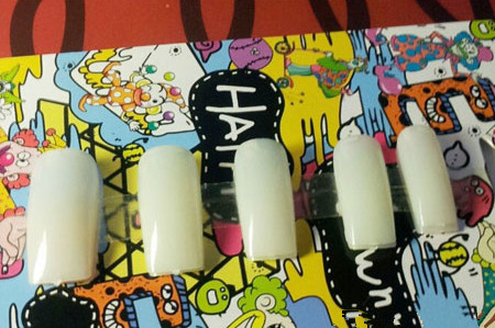 步骤五:等蓝色甲片上的白色颜料干了之后,将双面胶撕去,并涂上一层亮甲油。