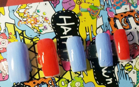 步骤二:海洋风指甲主要是蓝色和红色,用力均匀的在甲片上涂上蓝色和赤色,等其晾干。