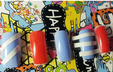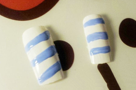 步骤三:再涂了蓝色的甲片上贴上细款的双面胶,注意掌握双面胶之间的间距。贴完之后,在双面胶上刷上白色的颜料,上色依旧要均匀不宜涂的太厚。