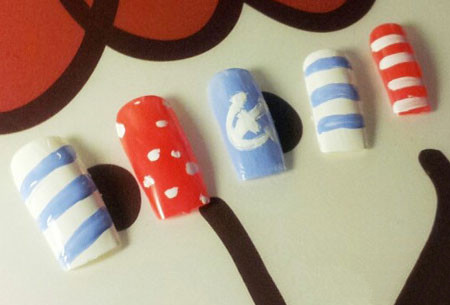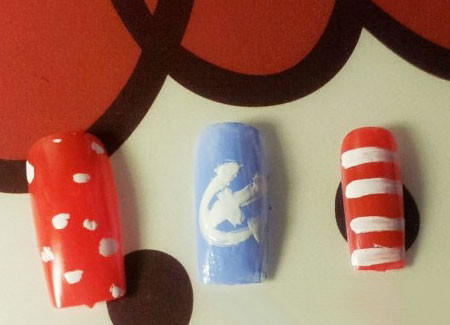 步骤四:在无名指的甲片上,画上船锚的图案,然后在红色的甲片上点上小波点。