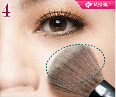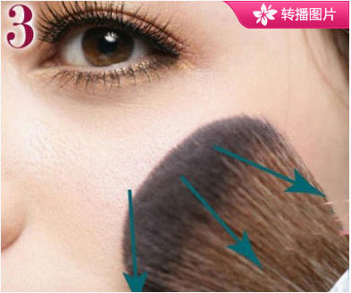 第三步:用干净蜜粉轻轻的刷刷开,再用干净的蜜粉刷把腮红和打亮彻底刷匀,也可带走余粉更轻薄,如下图: