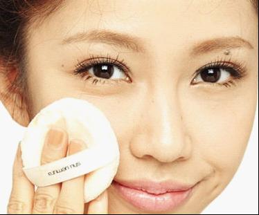 Step2:将粉底液分点散布在脸上,由颧骨至外部、额头向四周、鼻骨向鼻翼的顺序推开。如果想效果更加显著的话,可以选择白色或肉色的提亮粉,大刷子刷在笑肌、下巴、鼻梁、额头中间。