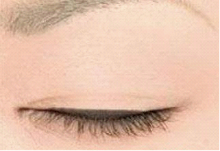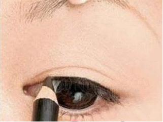 一只手提拉上眼皮,另一只手用眼线笔紧贴着睫毛根部,从内眼角向外眼角分四五段反复描画上眼线,睫毛间千万不要留有空隙。