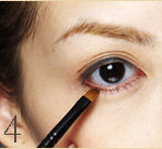 5、轻轻的拉起眼皮,视线注视下放,用眼线笔画内沿线(指睫毛根处),将Step1遗漏空隙全部填黑填满。