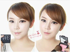 Step 8:选择粉色系腮红在颧骨处以斜刷的方式晕染。