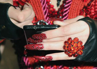 2013年纽约时装周已经落下帷幕,这次不仅服装、造型上下足了功夫,连指尖上的小小心机也充满天马行空的大胆创意。这款红色美甲妖娆魅惑,纤长的美甲上颗颗水钻点缀,无名指上更是扣着同色的吊饰,配上那枚硕大的宝石戒指,气场十足。